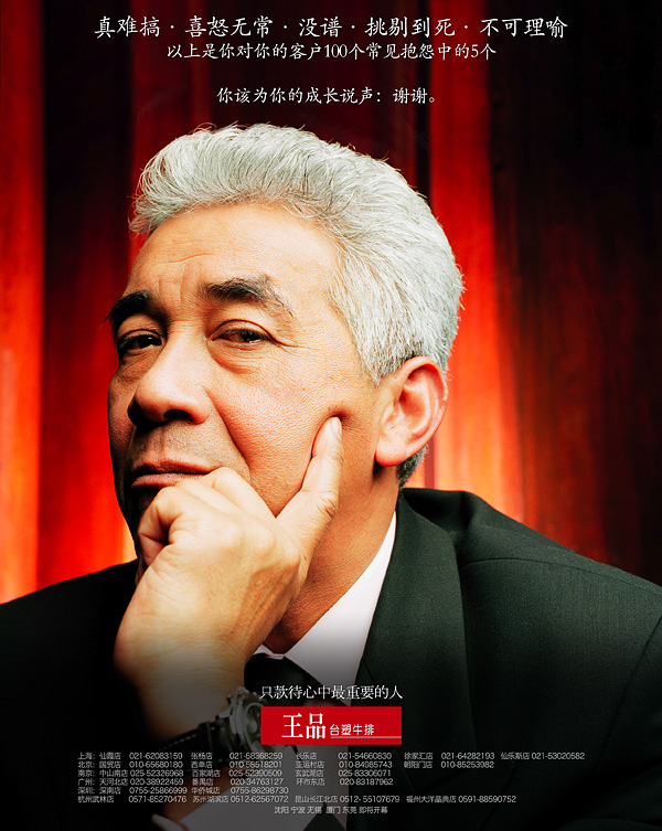 就让我们避开所谓的普世价值不谈,专心致志地看文案:真难搞·喜怒无常·没谱·挑剔到死·不可理喻,笔者很难从字里行间看出文案是在形容哪一类人?是上司还是客户??这让我的脑袋转了几个弯,但还得不到结论。那么我想我们应该可以从下面的文案确定猪脚了:以上是你对你的客户100个抱怨中的5个,应该为你的成长说声谢谢。从下图中头发雪白的成功男人身上,我看不到一个客户的基本属性信息,而只能在他傲慢的眼神和姿态中再次迷失,这到底是上级还是客户?
