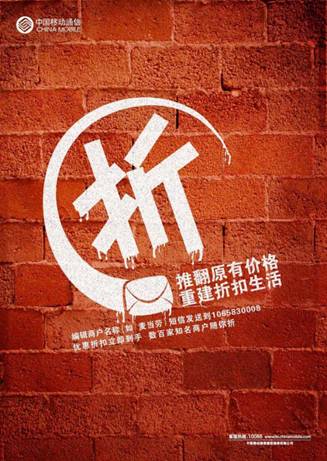 简评:打折广告怎么打?你可以活用“折”和“拆”,在转墙上写大大的“折”字,配以“推翻原有价格,重建折扣生活”的文案;也可以活用室外转角处的有利地形,将海报对折表现“折”的概念;当然,干脆把海报折起来,表现打折概念更直接传神!