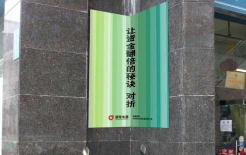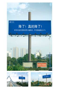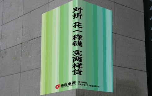 简评:为了表示费用一降到底,X展架索性直接连接地面了。原本高高在上的户外大牌也把身姿放下了三分之一。如此简明形象,如此低眉顺眼,你还不来,等什么呢?!