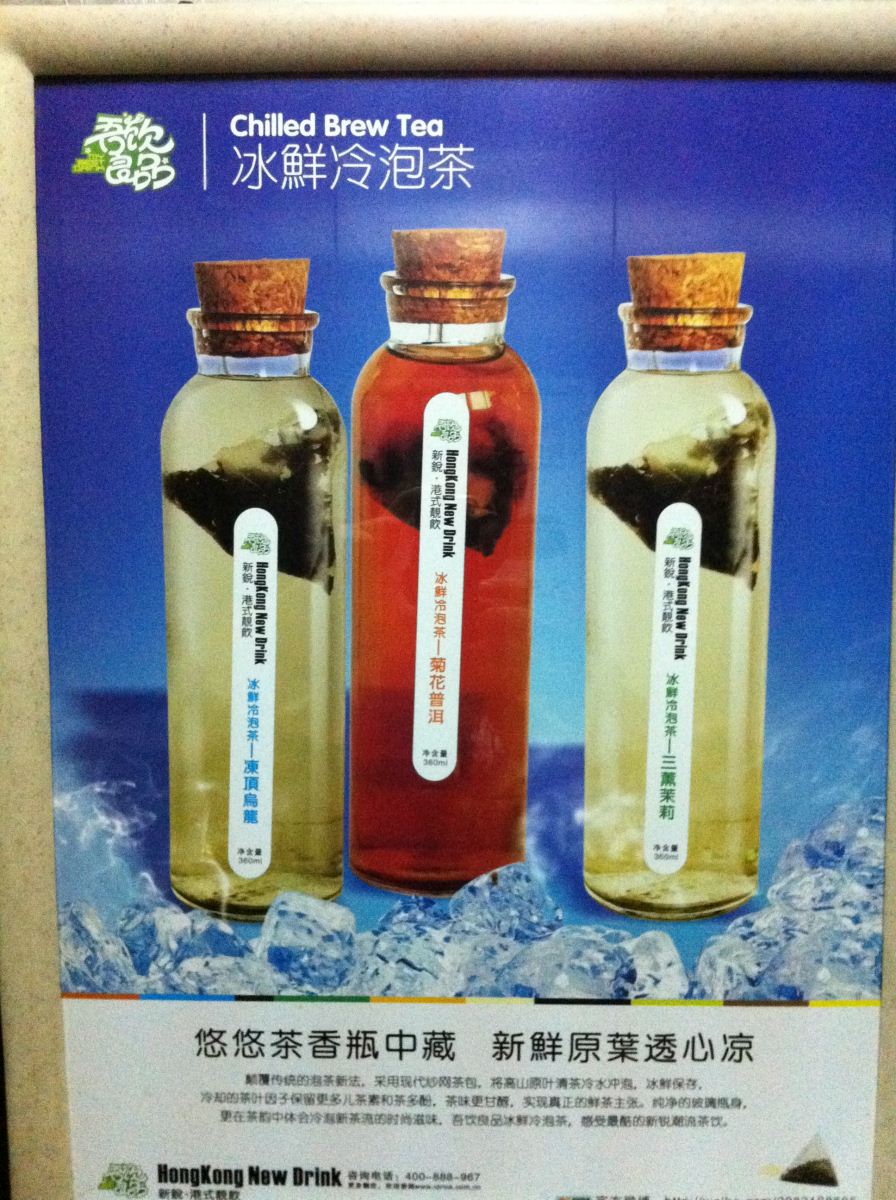大众设计在柏林公寓10楼,2008年我嫌太局促,于是拿下二楼同等大小的面积,一阵紧锣密鼓的装修,我和设计创意部门就上窜下跳了,前些时,在电梯里看到这个框架媒体发布的广告,先是一阵疑惑,看瓶子,这是我喝过的仟吉的冷泡茶啊?但为什么有不像是仟吉的东西呢?那个原先很感性的瓶子,被川字般呆呆的摆在画面中央,蓝色的背景色和瓶子没有任何关联,一看就是硬生生扣图后拼凑的,然后,也没有任何销售促进的活动,仟吉卖冷泡茶的时候,还有个很人性的种豆豆的活动啊,这一定不是仟吉。果然,定睛一看是吾饮良品的广告。早在微博上看到关于它模仿仟吉产品的事情,没想到,山寨的货,也可以大大咧咧的做广告了,但是,为什么我能一眼识别呢?一定就是山寨货差的就是原创作品的那点调调哦,也许,你可以模仿硬件(比如瓶子)到家,但是,精神的层面,是很难模仿的,齐白石说;学我者死似我者生,讲的就是神似大于形似。