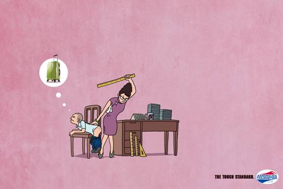 这一则创意海报,老师高举皮鞭似的直尺鞭挞小盆友的PP,小盆友却并没有哭泣,没有示弱,没有向各位观者求情博取怜悯,而是嘴角用力撇下,昂首坚挺着用意念对抗老师的体罚,头脑里没有别的念头,只有像美国旅行者行李箱那样坚强和倔强!(企业画册设计公司,影视广告制作公司