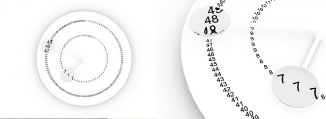 先从最简单明了的设计开始,这款挂钟简洁大方,动感十足。俏皮在于时针和分针一端安有放大镜。随时间前行放大相应的数字码。