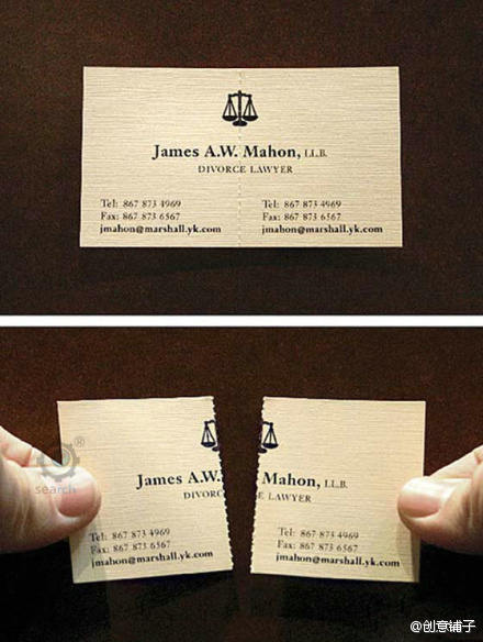 说它是一套名片,是因为名片从中间拆开,它可以由一张名片变成完整记录律师电话、传真、邮箱信息的两张名片,由夫妻双方各执一端。这样一套名片,从设计上,绝妙的表现了离婚是干脆利落,将一个家庭拆分回两个人的行为;从图像上,绝妙的表现了离婚律师为当事人公平公正公开分财产、保障双方利益的职业能力;从人性上,绝妙的表现了婚姻是平衡的艺术,离婚是一刀两断,再难弥合的行为,资源从此不再共享,夫妻双方需三思而后行;从环保上,绝妙的用一张名片起到了两张名片的作用,更绝妙的提示将来双方当事人若想复合,还可来找他。CI设计公司,VI设计公司,标志设计公司