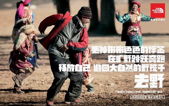 尽管将户外产品的营销意义刻意拔高了,但其户外的理念和多向度确实是可以同气连枝的,它鼓励个性和创造,鼓励人们“去野”。“去野”的用法本身就是一种创新,它将“野”变为动词,也将“野”作为形容词时修饰的物事,借代到认同The North Face的人群身上。一个字眼变换灵活,并透露出蓬勃的野性和生命力,本身就是打破了文化工业的超越性举措。