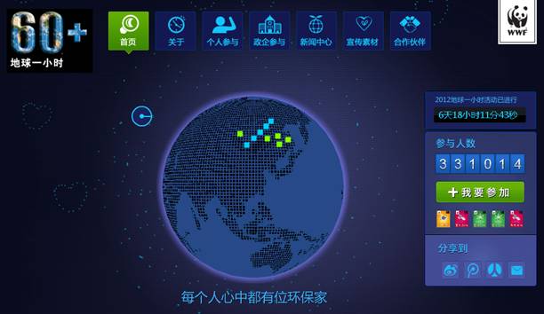 打开2012年地球熄灯一小时的中国网站,会看到一个关了灯光、安谧旋转的地球。2012年的活动宣传语沿用了李安的理论——每个人心中都有个绿巨人、每个人心中都有座断背山。中国地球一小时放出的版本是 “每个人心中都有位环保家”。或许由于是自发性公益广告的缘故,宣传语没什么新鲜的创意发挥,但是唤醒大众心中环保家的理念仍然值得推崇。