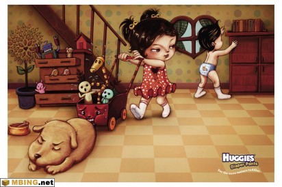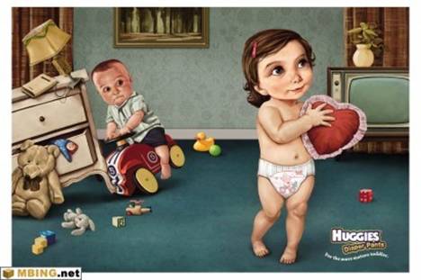 两则平面广告将含义表现得很清晰——好奇纸尿裤是魅力之源。这个场景在成人世界很常见:女人喜欢紧盯着研究同性的漂亮衣裳,男人容易被美女迷得七荤八素。在这里,女宝宝的推车即将轧到狗狗,男宝宝的汽车已经撞到书桌,都因为目光被磁场超强的纸尿裤小美眉吸住了。