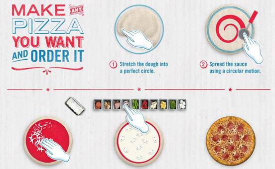 几个月前,他们制作了一款“Domino’s Pizza Hero”的ipad游戏,游戏流程和我们玩的各种做饭小游戏并无二致,就是和面胚、刷调味酱、放配料、送进烤箱,游戏再给个评分。区别在于这个小游戏可以把自己的成果变成实物,做完披萨按下“订购”,距离最近的达美乐连锁店就会把按用户要求制作的披萨送上门。