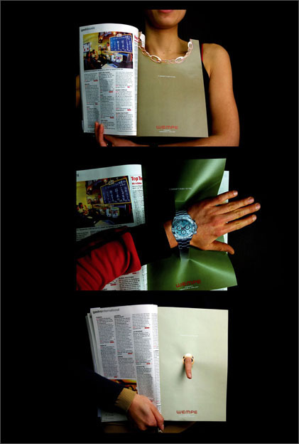 最常见的普通产品广告经过创意发想,变成了最潮的交互式广告。宅女宅男不爱出门?没关系!在家就可试戴wempe首饰,看看是否彰显自己的气质。wempe画了个流光溢彩的饼送给阅读者,好卖相让人心里好痒痒。