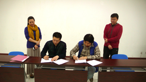 签约现场,前排左为长江日报广告公司总经理李峰,前排右为武汉大众设计策划顾问有限公司林立总经理