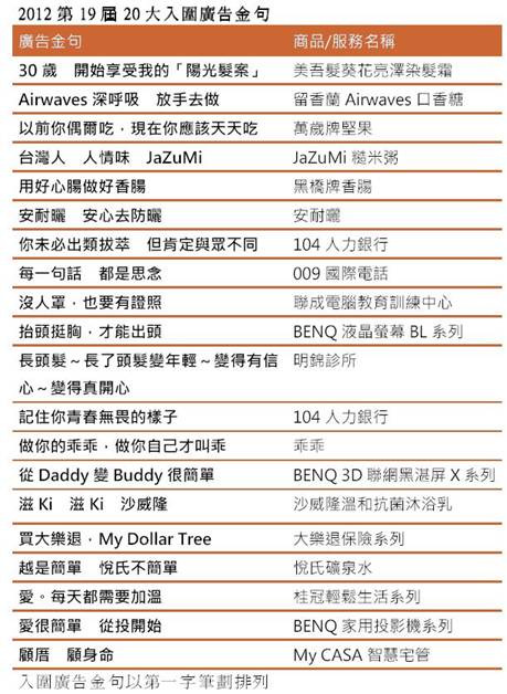 台湾的广告大多都打温情牌,2012年第19届台湾广告流行语金句奖的入围广告语更加发扬了这种风格,平淡实在,朴素诚恳。与之相反,大陆某些虚假广告辞藻夸张、功效显著,却频发各种黑心食品药品事件、常被揭露行业内幕丑闻。