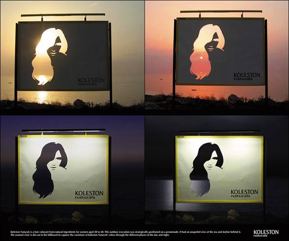 强大的创意:这是koleston染发剂的户外广告牌。广告上绚丽的头发色泽并非模特+染发剂+发型师+后期制作的结果,而是纯粹的自然之美。他们将女性头像的头发和五官镂空,借助天色阴暗的变化,赋予美发自然光影的颜色。