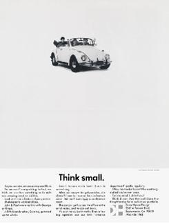 20世纪60年代,DDB公司的伯恩巴克为大众甲壳虫提出了“think small”的创意:想想还是小的好——当你挤进狭小的停车场时,当你更换那笔少量的保险金时,当你支付修理帐单时,或者当你用旧大众换新大众时,请想想小的好处。