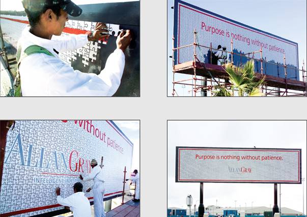 文案很简单,“实现任何目标都需要耐心”,也没有画面的创意。新意在这个户外大牌并非通常的喷绘画布,而是工人用6000块拼图,花了4个星期拼成的,身体力行地实践了Allan Gray的耐心观。武汉企业画册设计公司,武汉影视广告制作公司