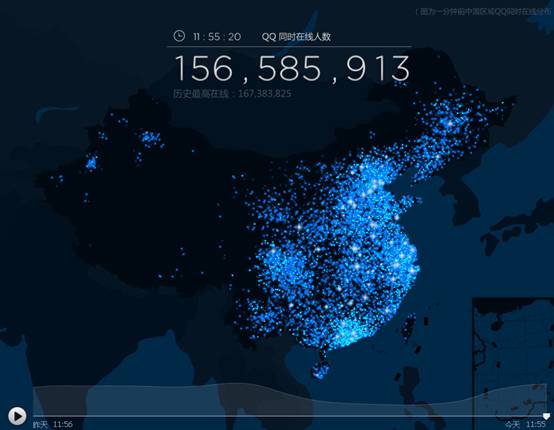 近日,腾讯上线了一项新功能:中国区域QQ同时在线分布,实时提供QQ同时在线人数和分布。据称这个页面实时更新同时在线人数,数字不断跳动,蓝点表示在线QQ用户的分布,并可快进查看过去24小时内用户变化。武汉CI设计公司,武汉VI设计公司,武汉标志设计公司
