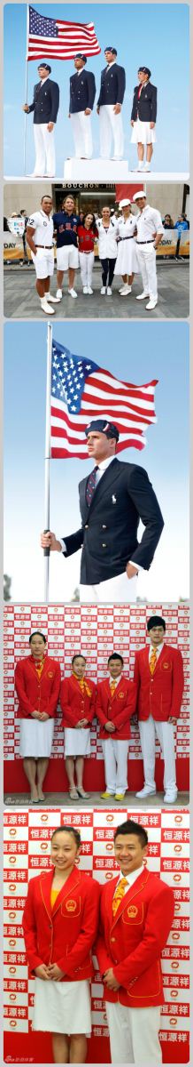 美国队:美国奥运会队服结合了美国国旗颜色和海军风,效果复古又时尚。但却被眼尖的媒体逮住了把柄——标签上注明“Made In China”。近两个月美国失业率维持在8.2%,纺织业也陷入了困境,奥运会队服的生意却居然给中国人创造就业机会去了,实在是政府的失职。这令美国国会议员非常不满,甚至情绪激动地倡议,应该烧掉这些衣服,重做!