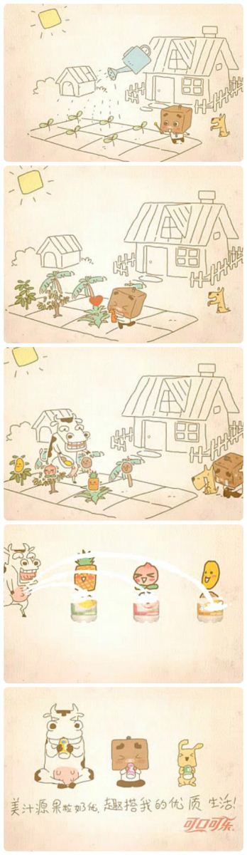 张小盒,是与兔斯基、阿狸等同期出道的草根动漫形象,被誉为“最著名的中国上班族动漫形象代言人”。这个“奶牛篇”是美汁源果粒奶优投放在《张小盒试验动画》上的广告。广告与动画的联合不算少,电视广告本就常常采用动画的形式。不过由网络动漫形象原创的广告却由于画质简陋、质量不高,并不多见。这部又萌又小清新的广告动画片,闪耀着跨界的智慧与别致,难得一见。