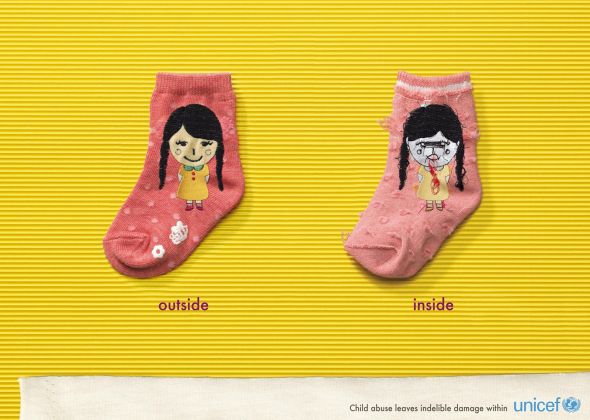 现在的纺织品多用机器绣花,绣出来两面并不一样,一面美丽,一面糟乱。这是我们都已习惯的日常生活的一小部分内容。联合国儿童基金会,以此素材展示了两件儿童小袜子、小衣服,比喻遭受虐待的儿童。就如这上面的绣花一样,这些儿童外表灿烂美好,内心却凌乱不堪。比起呆板的公益说教,小袜子的展示更令人心痛。武汉广告公司,武汉广告设计公司,武汉企业画册设计公司