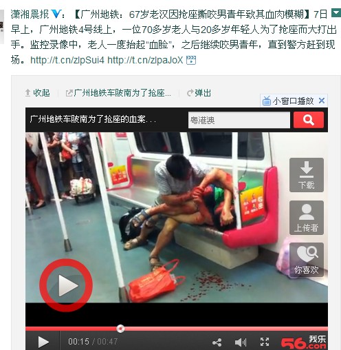 作为湖南省内发行量最大报纸的官方微博,《潇湘晨报》在10月8日15时25分发布了如下一条微博:“【广州地铁:67岁老汉因抢座撕咬男青年致其血肉模糊】7日早上,广州地铁4号线上,一位70多岁老人与20多岁年轻人为了抢座而大打出手。监控录像中,老人一度抬起“血脸”,之后继续咬男青年,直到警方赶到现场。http://t.cn/zlpSui4 http://t.cn/zlpaJoX。” 除了文字,还配了一段相当血腥的视频。