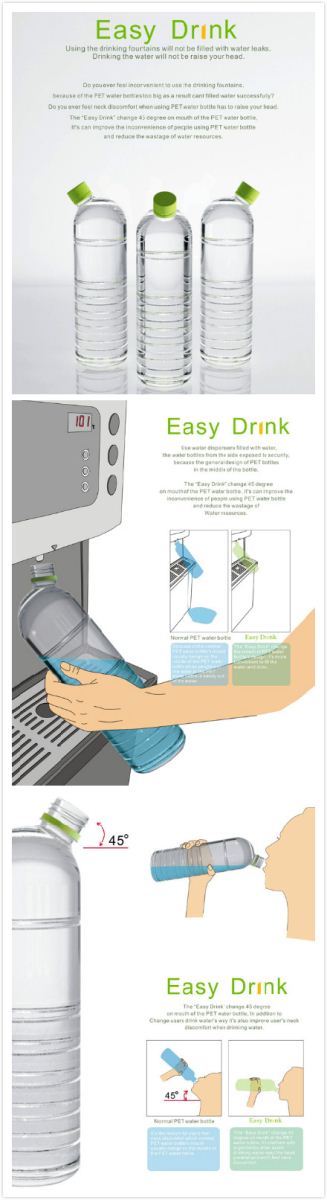 但是,一个好设计决不能止步于简单!瓶嘴的奇怪角度视觉上明显缺乏美感,心理上也会产生扭了脖子的不适感。一个本属于很实用的设计,却并不能面世,只有网上的设计图,长得丑是不是也是一个原因?