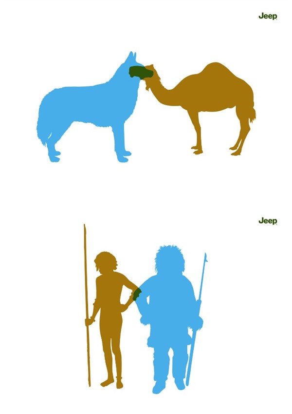 海报上的动物和人占据了绝大部分版面,而爱斯基摩人&非洲土著肘部,牧羊犬&骆驼嘴部那一点点的交集区域,才是海报的主角,Jeep。
