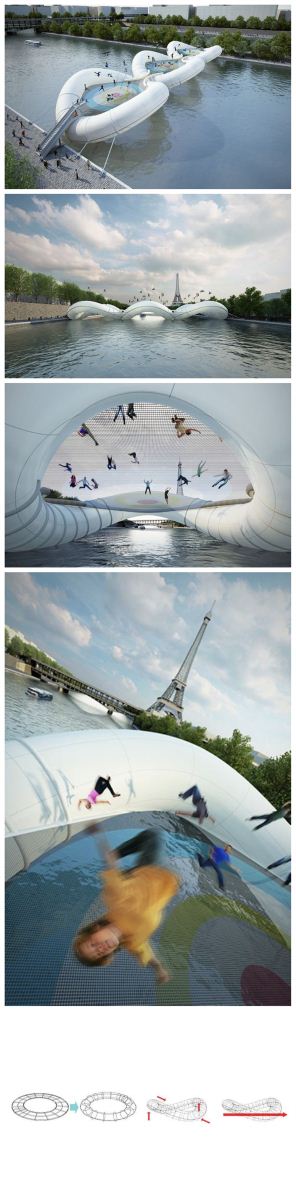 巴黎AZC建筑公司近日在巴黎塞纳河上架起了一座蹦床桥。蹦床桥由三个直径为30米的可充气组件接合而成,里面灌入了3700立方米空气。组件充气之后会变成拱形,蹦床网将被固定在这些组件上。为了方便试玩者上下桥,设计者在两端都安置了梯子和滑梯。武汉CI设计公司,武汉VI设计公司,武汉标志设计公司,武汉logo设计公司