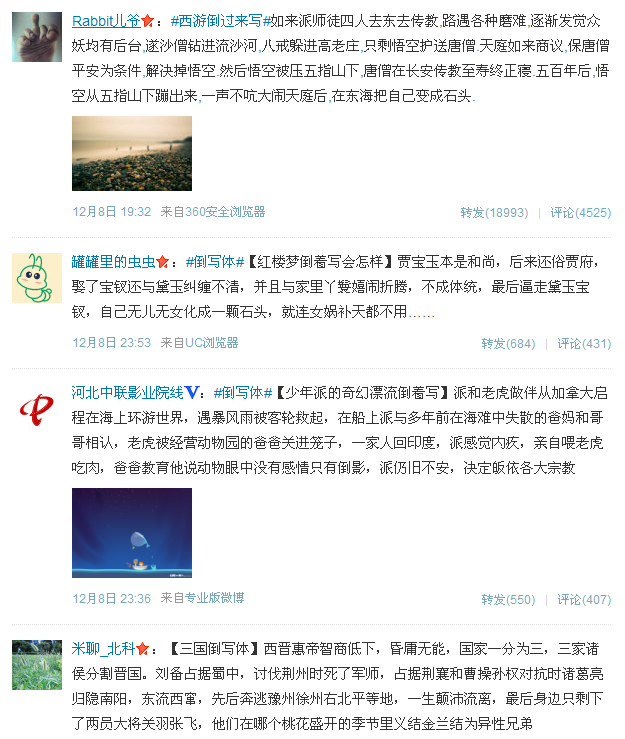 还有更牛的,例如新浪微博网友@Rabbit儿爷,他发明了一种“倒写体”,即是用倒叙的方式重新讲一遍历史或书籍中的故事。有意思的是,这种倒写不仅创新了名著,还将原版的故事更赋予了几分现实和深刻。