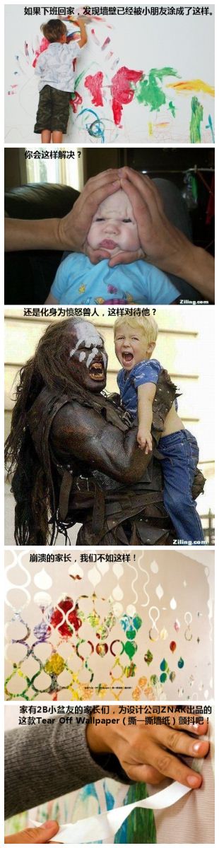 家长们,为设计公司ZNAK出品的这款Tear Off Wallpaper(撕一撕墙纸)颤抖吧! 从普通用途来说,把撕一撕壁纸贴在墙上,你就可以按预先设定好的蛇鳞纹路,撕出自己喜欢的各式图案,没有创意的人群也能把自己的家打扮得有趣、独具个性化与多样化。 从文艺用途来说,你可以预先在墙面绘画,与墙纸混合交织后,撕一撕墙纸则会显得更为个性和炫丽。 而对于家中有个2B小盆友的家庭,即使是乱七八糟的鬼画符,也能与撕一撕搭配出艺术般的精彩效果。你完全可以从“愤怒的魔鬼”这个身份解脱出来,挂出圣母玛利亚的微笑,对那位小盆友说:“亲爱的小约翰,你是不是还没有画过瘾呢?来,用更多的色彩画出你的小天地,拔拔/麻麻会把它变成艺术品的哟。不过,以后千万千万千万千万不要再画在墙上了哦哦哦哦~~~~~~~~~~~~~!!!!!!”