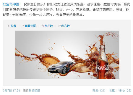 大品牌的调侃互动在微博上已是屡见不鲜,然而就在3月7日BMW 97周年这天发生在BMW和可口可乐这两个经典品牌之间的互动,却让人们看到品牌之间互动的另一种可能性: