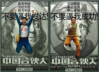 天涯八卦版主“八卦-我实在太CJ了”更是在 新浪 微博中晒出“不要逼我”海报各种PS后的版本,该微博一夜间的转发数近四万,包括李铁根、天才小熊猫、所长别开枪是我、尸姐等在内的草根微博纷纷排队转发“不要逼我出柜”,“不要逼我开枪”,“不要逼我做一个比这个还长的微博”。《中国合伙人》的官方微博甚至开放了这套海报的原始背景模版,供网友下载PS娱乐。