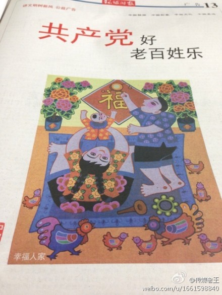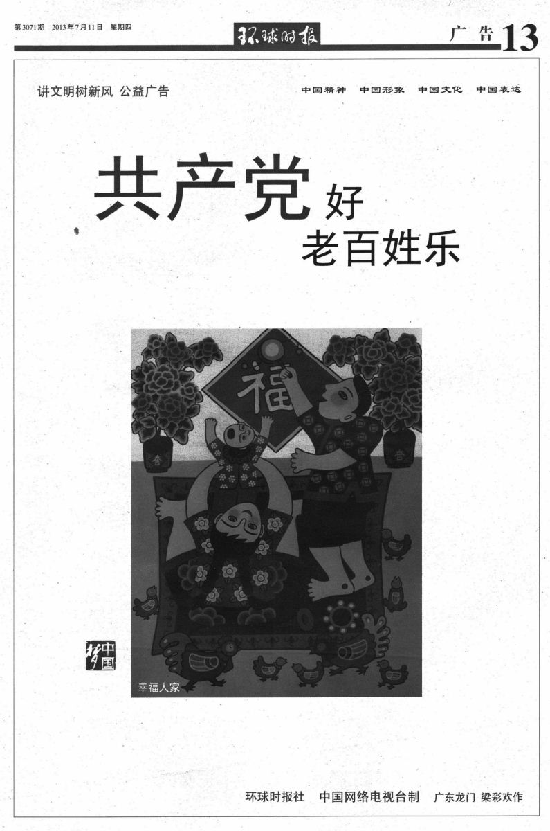 是的,你没有看错!2013年由,不是抗战时期共产党的招贴画!也不是文革时期郭沫若老先生的吹捧诗。环球时报相应中央宣传要求(也很有可能是被要求),因我党带领全国人民过上大好日子而有感,在13版不禁真心吐露了对我党的感恩之心!