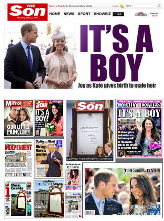 22日,凯特王妃诞下男婴,他将成为英国未来国王的第三个顺位继承人。英国疯狂了。各大头版、整版大图、超大字号的新闻版面也彰显着媒体同样嗨翻了——然而,他们又悲剧了。面对《太阳报The Sun》改为《太子报The Son》的报头,其他媒体想破脑袋的爆炸性标题,被秒成了渣。