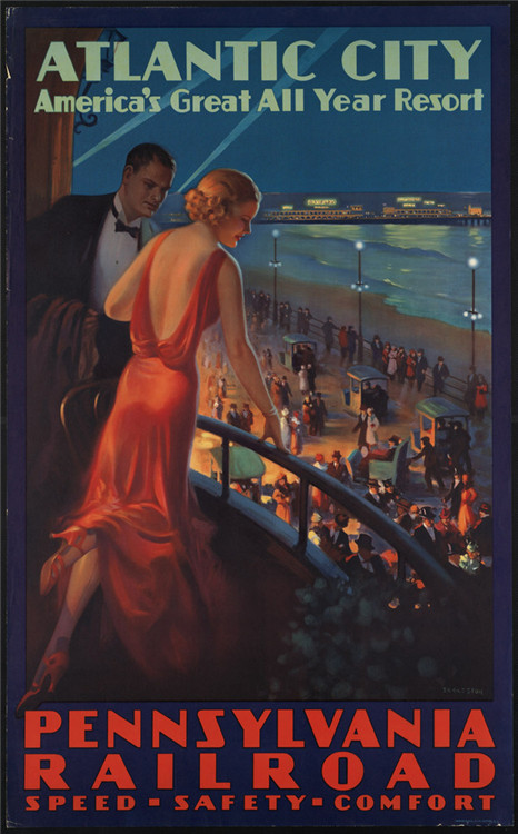 图为宣传美国的旅游海报,海报中的金发美女和夜晚街道上的繁荣景象,真实地在线了当时美国的社会特征,实为经典