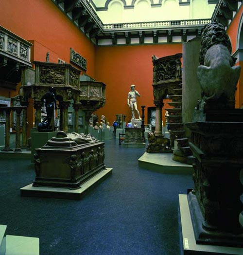 博物馆一楼 最令人叹为观止的内部装饰之一,就是1873年开放的仿制品展厅。他们将雕塑和建筑装饰的石膏仿制品放置在这里,其中包括古罗马图拉真之柱的巨大仿制品。 到了19世纪90年代,博物馆已经包括了办公室、展示长廊和图书馆三部分。为了使这个场所变得更加完整,图书馆方面任命了后来设计了白金汉宫正面的阿斯 顿·韦伯来执行这项工作。他的扩展补充带来了大理石阶梯 、悠长的远景以及有着顶部照明的长廊,为这长达50年的建设计划画上了一个圆满的句号。