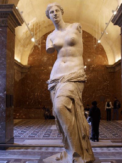其雕像于1820年2月发现于爱琴海的希腊米洛斯岛一座古墓遗址旁,是一尊手臂残缺的大理石雕塑。为半裸全身像,面容俊美,身材匀称,衣衫滑落至髋部, 右臂残缺,仍展示出女性特有的曲线美,显得端庄而妩媚。法国重金收买后陈列在卢浮宫,以其绝世魅力震动了世界,从此,“断臂维纳斯”就著称于世,成为爱与 美的象征。