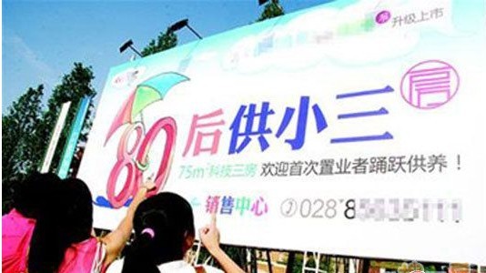 前段时间,某楼盘的户外广告语——“80 后供小三房”在网上引起了争议,该广告使用“小三”这个容易引起歧义的词汇,这种以低俗手段制造噱头的广告创意,不单单是有悖社会公德,更是一种无知无畏的表现。武汉广告公司,武汉广告设计公司,品牌设计公司,平面设计广告公司