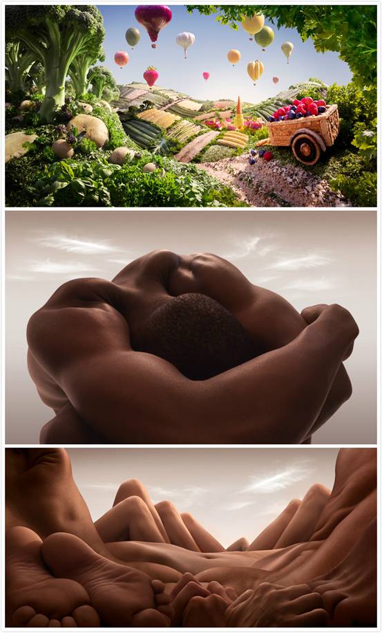 饮食,男女,人生中最重要的两件事,自然也是最常见的事物。Carl Warner的摄影,不仅将两件事赋予了极为郑重的仪式感,更探寻到了常人未能发现的艺术桃花源。“人体景观”与之前的“食物风景”相呼应,大镜头阐释着何为真正的“秀色可餐”!