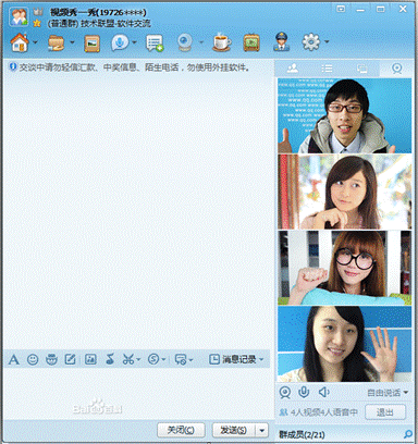 YY语音和腾讯群视频的界面内容是大致相同的:用户ID,用户发言、频道主持/主视频者。不同的,是腾讯总比被抄袭者更漂亮的界面、更简洁的交互、更明确的功能指向。