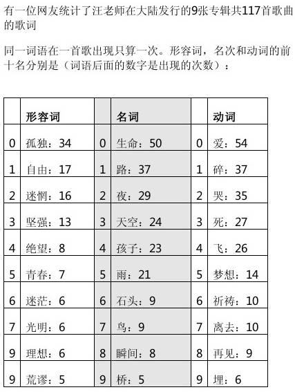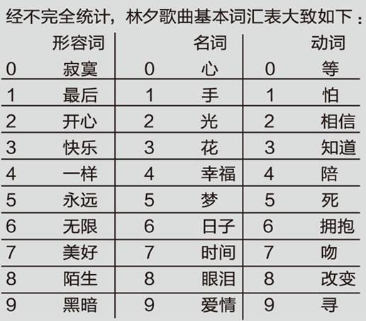 大致看完了这六位创作人的高频词汇,现在我们可以来简单写一首流行畅销歌词啦,将动名词相应组合一下,我们不难得出“回忆过去的爱情,觉得幸福却又有些寂寞”、“让我再等待一天,你的世界我可还在里面”……好吧,你们任意组合吧,我们也只能帮你到这了!