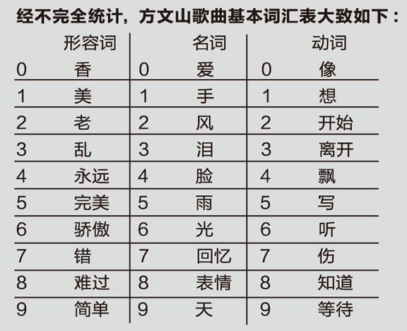 托《南都娱乐周刊》的福,我们现在有了一份各大歌星的歌词秘籍。绝不需要认真研习,直接傻瓜式套用。想装B,找汪峰;想哀愁,方文山;想忧郁,找许巍;要睿智,李宗盛;要谈情,找林夕;要青春,五月天;想嗨起来,当然凤凰传奇啦!