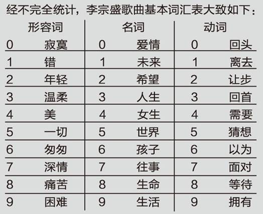 本刊分析:当下乐坛普遍浮躁,如宗盛大哥般坚持“走心”风格之人难得。正如他的音乐会名称“感性与理性”,李宗盛的词作就如一位风景看透之人游刃有余地行走在感性与理性之间。没有失态的抒情,也没有故弄玄虚的“形而上”,完全就是一位极富生活阅历与人生智慧的豁达大叔一边拍着你的肩,一边温和地一笑,为你慢慢讲出一些人生道理,让你自己去领悟。从词汇表看来,宗盛大哥惯用的形容词多为“走心”式词汇,情绪节制,意味隽永,组合起来会自动呈现出一种温厚的人生智慧。而名词方面亦多为生活话题,“爱情”成为李氏情歌中最主要的关键词。动词方面多以“双字词”为主,深具上世纪八九十年代台湾当代文学之风骨,态度豁达,气质平和。