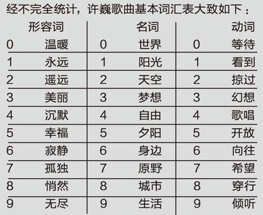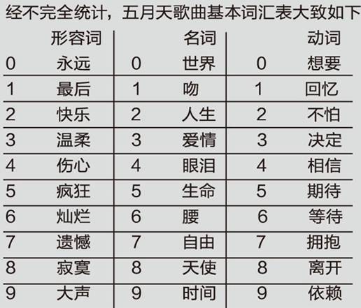 本刊分析:五月天的歌曲之所以被称为“青春摇滚史诗”,从以上词汇表中便能看出缘由。其歌词中被高频使用的自然意象(风、阳光、彩虹)及人文意象(爱情、自由、天使)都十分贴近现实生活,寓意向上且雅俗共赏,富有青春期的蓬勃朝气同想象力。其形容词与动词的使用充满一种“温柔的暴烈”,“灿烂”、“疯狂”、“拥抱”、“依赖”等词均是青春文学中的高频词汇,也是大家对酷烈的青春时光最温柔的一种回忆。