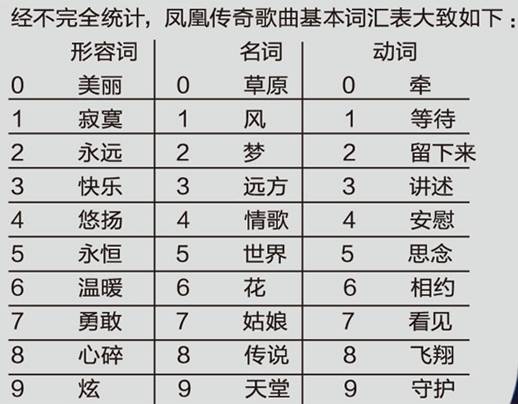 本刊分析:不愧是走到哪里都酷炫狂拽牛炸天的凤凰传奇组合,其最常使用的词汇无论是形容词、动词还是名词均“地气十足”,充满生活色彩,无怪乎神州各地的广场舞大爷大妈们将其的每一首作品奉为圭臬,你看名词部分既有“姑娘”、“情歌”、“花”这种古往今来人民群众喜闻乐见的传统意象,又用“草原”、“天堂”、“远方”满足了大爷大妈心中潜藏已久的“文艺”情结,“既喜闻乐见又能装文艺逼”,凤凰传奇真是“你若不红,天理难容”。