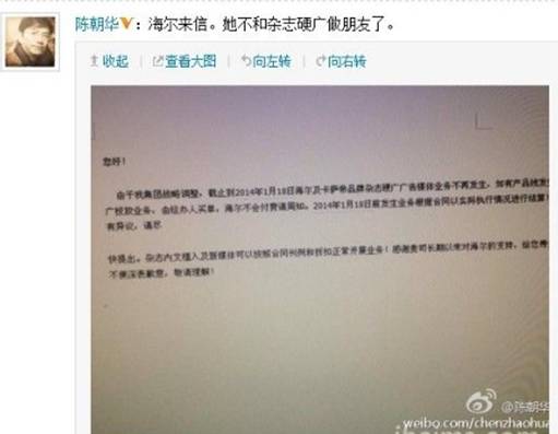 “由于我集团战略调整,截止到2014年1月18日海尔及卡萨帝品牌杂志硬广广告媒体业务不再发生,如有产品线发生硬广投放业务,由经办人买单,海尔不会付费请周知。”海尔在邮件中如是说。