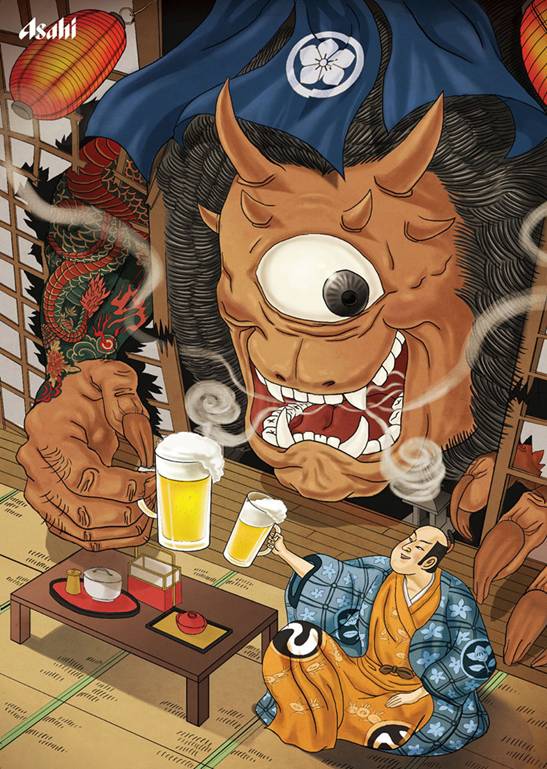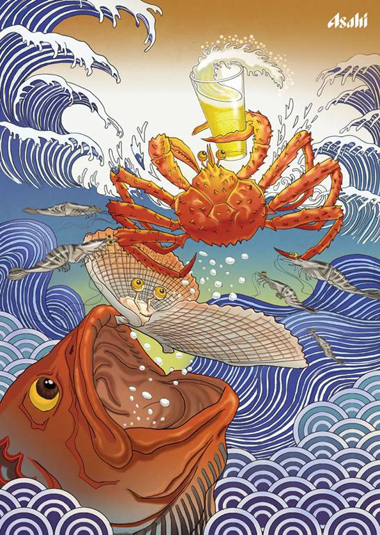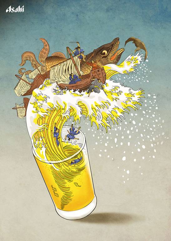 如下是朝日啤酒的海报。作为日本四大啤酒之一,朝日啤酒以善于改进口味、适应人们新需求的啤酒而闻名。有趣的是,领衔潮流的它,本系列海报却选用了传统的Nihonga画风,戏谑地将产品画入古代。