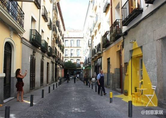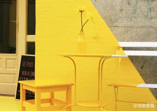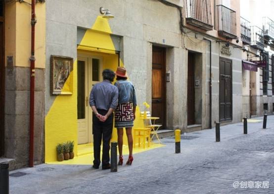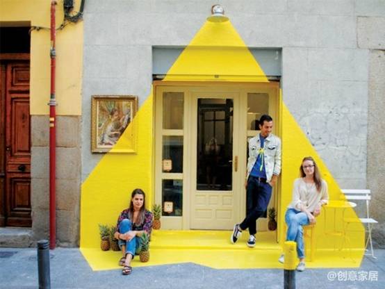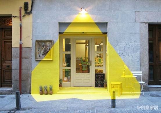 ——用鲜艳的黄色框出店面范围,在一片灰白的墙面上显得非常突出。预算20元油漆费,产出的抢眼度,不用我多说!