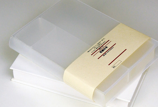 将物件归类的习惯,已经成为了生活的一部份,但我们有时会碰到无法决定物件收纳位置的情况。如果将收纳盒作成书的形状,就可以简单的决定收纳盒的放置位置了。结合无印良品的PP收纳盒和一般的书本的形状,书脊上可以写下物件的类别。「收纳书」和书本一起排列在书架上,但其和书架上的书本不同,有着收纳的功能。