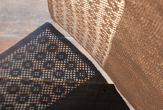 <<蔺暖帘沁人心脾的气味光线下质朴&华丽的影子游戏>> 蔺暖帘将传统的编织手法和花纹运用到暖帘中,在悬吊着的同时,可以让蔺草同时接受更多的日照,散发出更浓郁的草香。透过光线照射,营造不同的投影,为空间制造更多意想不到的效果。可随意拆卸的组合也可以依据心情更换不同花纹,随时享受自己设计的乐趣。