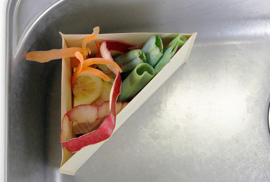 存放厨余垃圾三角垃圾架,容易长霉、不卫生。如果将垃圾袋直接作成三角形的垃圾架,使用可滤水的材质,在厨房工作的最后一起丢掉,仅需在使用时放置在流水台中,卫生又美观。三角垃圾袋使用了成长快、可吸收空气中的二氧化碳的洋麻或竹纸浆等植物环保新材料。