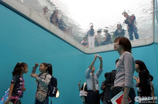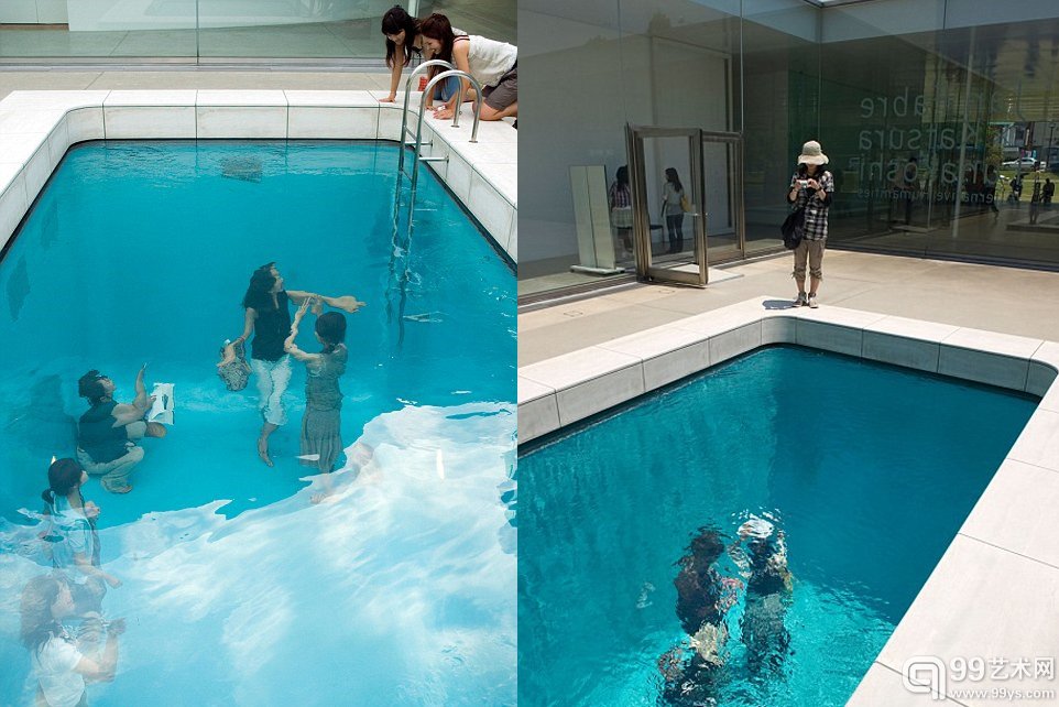 据英国《每日邮报》1月11日报道,阿根廷艺术家莱安德罗·埃利希(Leandro Erlich)日前在日本西部城市金泽(Kanazawa)21世纪当代艺术博物馆建造了一个神奇的泳池:衣着整齐的游客看上去仿佛正在超过2.7米深的 水下安然自若地行走。但事实上,这只是10厘米深的水被夹在2块透明玻璃之间产生的光学错觉。