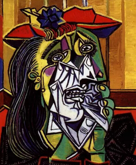 西班牙画家毕加索在《哭泣的女人》这部作品中,他以粗线条、硬式的笔风描绘了一个精神处于极度悲伤状态女人的表情和内心强烈的痛苦。画中对女人扭曲并形成 碎片的脸的描绘是毕加索立体主义思想的发展。《哭泣的女人》,也是毕加索后期畸形女人作品中最动人的一幅。有人说毕加索把自己给了魔鬼,把画笔给了上帝; 而对于这一幅作品,他把痛苦给了女人,这个女人,就是朵拉·玛尔。朵拉·玛尔即是毕加索的情人,她经常不能自抑地大哭。
